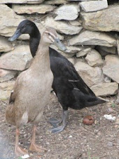 Le Coureur Indien est un canard d'un poids inférieur à 2 kg qui ne vole pas. Son allure est très insolite : au contraire de ses congénères il a un port très redressé et sa démarche est rapide et gracieuse, sans se dandiner. Cette race semble-t-il originaire du sud-est asiatique a été introduite en Angleterre au XIXeme siècle, puis en France, où jusqu'au début du XXeme siècle, les canes étaient connues pour être d'excellentes pondeuses (jusqu'à 350 oeufs par an de 65g à 80g). De nos jours ils sont surtout élevés à des fins d'ornement mais aussi pour leur goût des vers, limaces et insectes. Les coureurs indiens sont très utiles au jardin pour éliminer les limaces et escargots. Contrairement aux poules, ils ne feraient pas de dégâts car ils ne grattent pas le sol. Akka et Mika sont encore toutes jeunes, 3-4 mois, elles devraient se mettre à pondre à l'age de 6 mois.